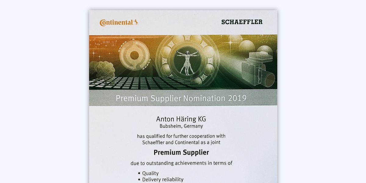 The special award is presented by the Continental and Schaeffler companies and was presented to Anton Häring KG for the third time in a row this year. The family-owned company has been one of the 32 premium suppliers since 2015. “Of course we are proud to continue to impress in terms of quality, delivery reliability, costs and innovation. These topics are very important to us and part of our corporate culture, ”explains Dr.-Ing. Jürgen Häring, president of Anton Häring KG. Every two years, Continental and Schaeffler award the 32 best of the more than 1,200 strategic suppliers.