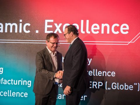 Geschäftsleitung Jürgen Häring steht auf der Bühne und schüttelt die Hand mit einem dunkelhaarigem Mann in Anzug