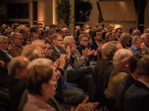 Publikum sitzt vor einer Bühne, darauf die Geschäftsleitung Jürgen Häring unterhaltet sich mit einem dunkelhaarigem Mann